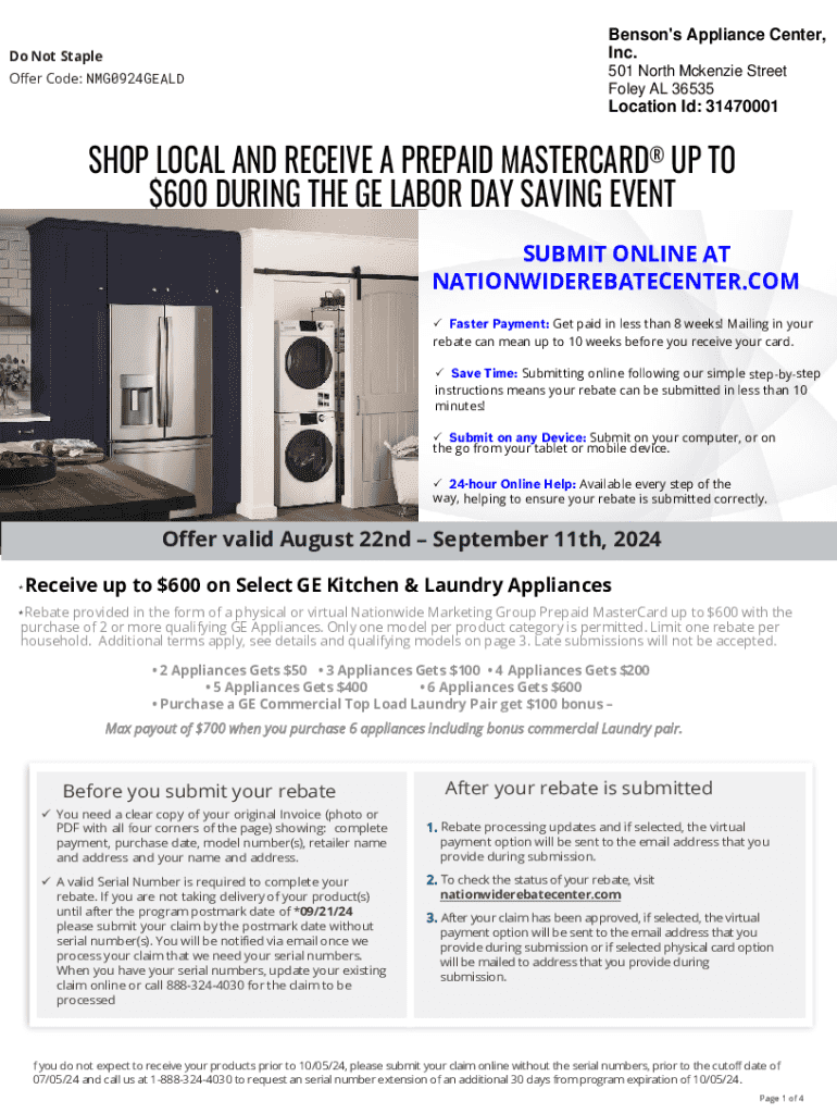 This document outlines the details for the GE Labor Day Saving Event, providing customers with information to apply for rebates on qualifying GE kitchen and laundry appliances. It includes instructions for online submissions, rebate amounts based on the number of appliances purchased, and the eligibility criteria for the promotion.