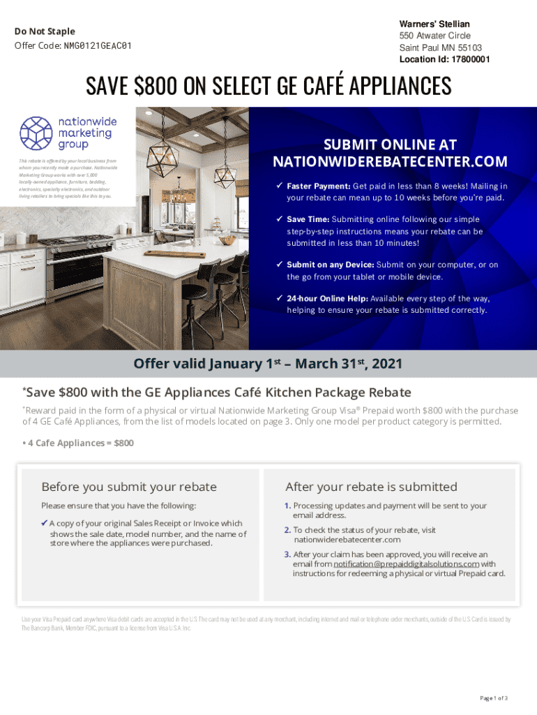 Warners\' Stellian 550 Atwater Circle Saint Paul MN 55103 Location Id: 17800001Do Not Staple Oer Code: NMG0121GEAC01SAVE $800 ON SELECT GE CAF APPLIANCES SUBMIT ONLINE AT NATIONWIDEREBATECENTER.COMThis