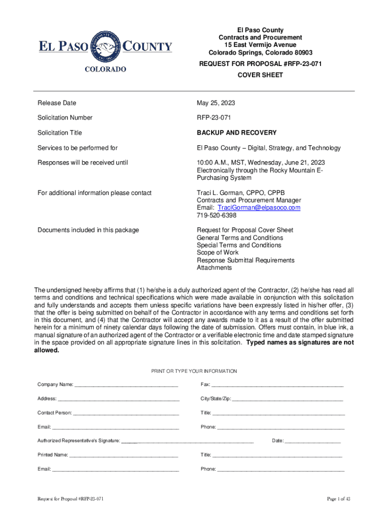 This document is a Request for Proposal (RFP) issued by El Paso County for the purpose of securing backup and recovery services for its digital operations. The RFP outlines the necessary qualifications, submission requirements, and evaluation criteria for contractors interested in providing these services. It covers project objectives, required documentation, scope of work, project organization, cost estimates, and contract terms.