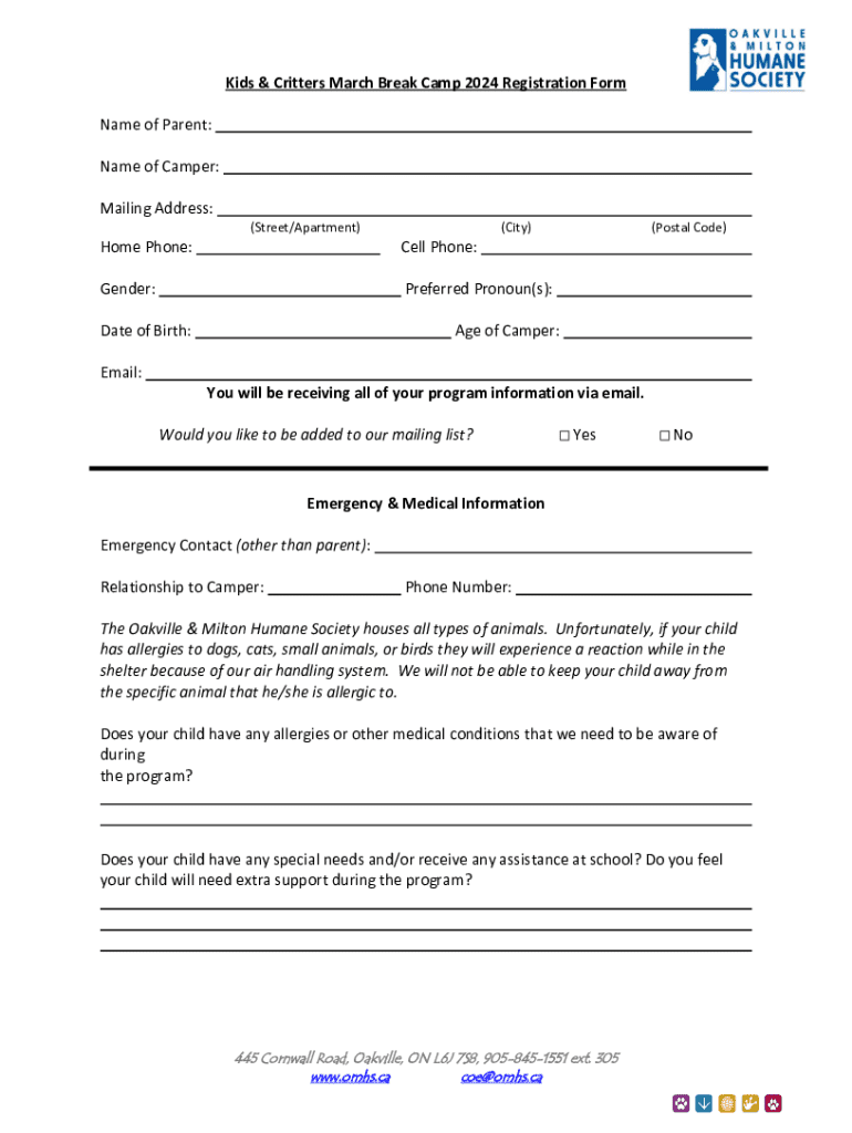 Register TODAY!Kids & Critters March Break Camp 2024About the Camp The Oakville & Milton Humane Society is a resource centre that promotes the human/animal bond through education. We emphasize kindness,