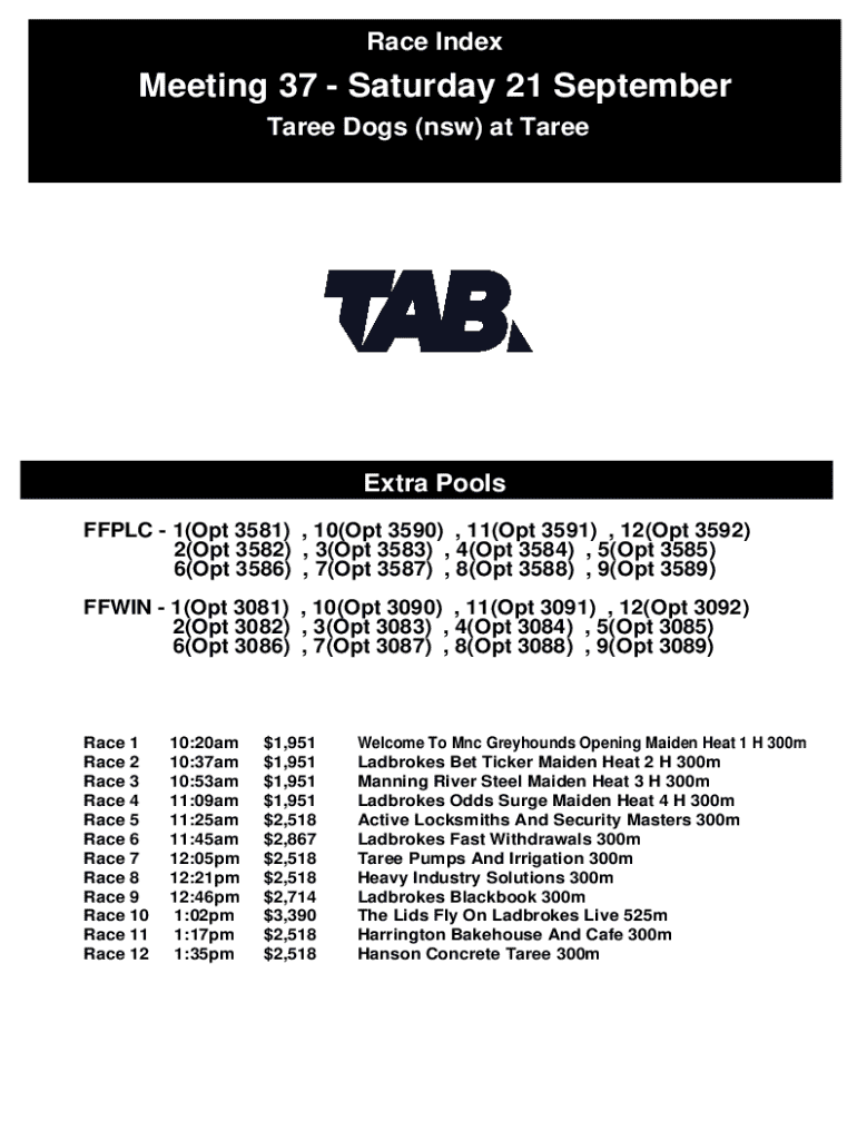 Race IndexMeeting 37 Saturday 21 September Taree Dogs (nsw) at TareeExtra Pools FFPLC 1(Opt 3581) , 10(Opt 3590) , 11(Opt 3591) , 12(Opt 3592) 2(Opt 3582) , 3(Opt 3583) , 4(Opt 3584) , 5(Opt 3585)