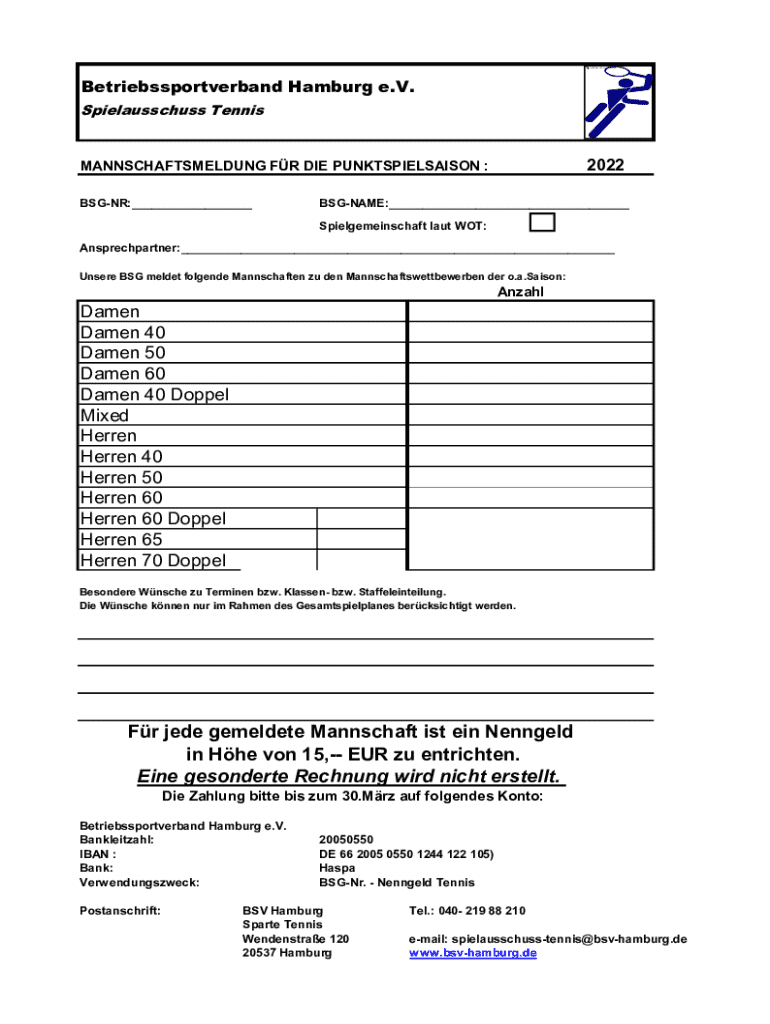 Das Bild k ann nicht angezeigt werden.Betriebssportverband Hamburg e.V. Spielausschuss Tennis2022MANNSCHAFTSMELDUNG FR DIE PUNKTSPIELSAISON : BSGNR:___BSGNAME:___ Spielgemeinschaft laut WOT:Ansprechpartner:___