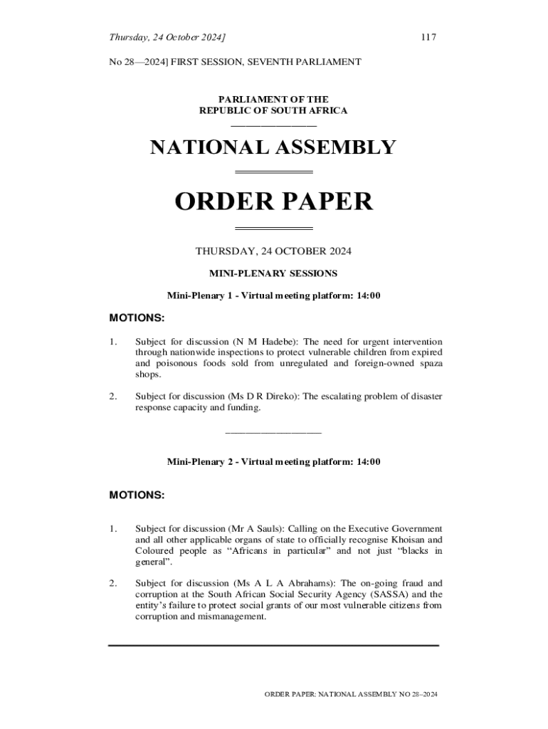 Thursday, 24 October 2024]117No 282024] FIRST SESSION, SEVENTH PARLIAMENTPARLIAMENT OF THE REPUBLIC OF SOUTH AFRICA ___NATIONAL ASSEMBLY ORDER PAPER THURSDAY, 24 OCTOBER 2024 MINIPLENARY SESSIONS