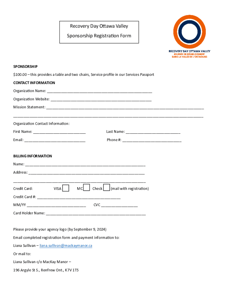 This form is used for organizations to register as sponsors for the Recovery Day event in Ottawa Valley. It includes contact and billing information, as well as options for payment and submission instructions.