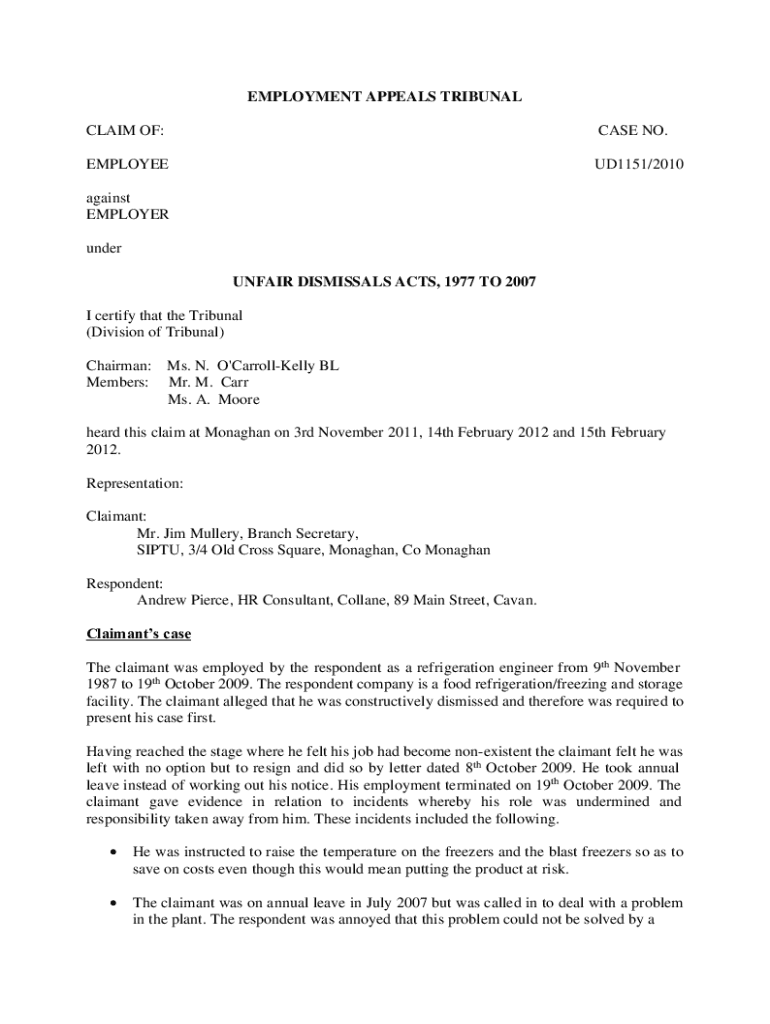 EMPLOYMENT APPEALS TRIBUNAL CLAIM OF:CASE NO.EMPLOYEEUD1151/2010against EMPLOYER under UNFAIR DISMISSALS ACTS, 1977 TO 2007 I certify that the Tribunal (Division of Tribunal) Chairman: Members:Ms.