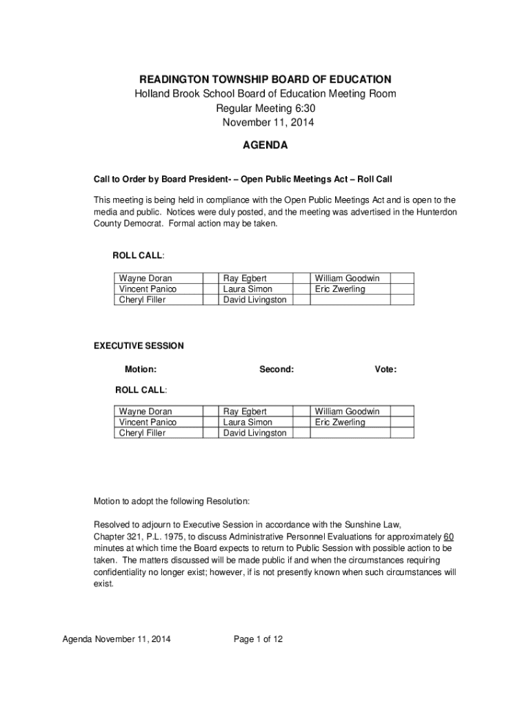 READINGTON TOWNSHIP BOARD OF EDUCATION Holland Brook School Board of Education Meeting Room Regular Meeting 6:30 November 11, 2014 AGENDA Call to Order by Board President Open Public Meetings Act