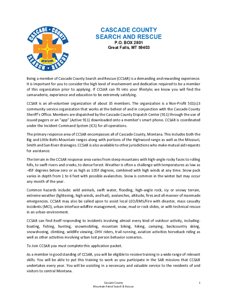 CASCADE COUNTY SEARCH AND RESCUE P.O. BOX 2801 Great Falls, MT 59403Being a member of Cascade County Search and Rescue (CCSAR) is a demanding and rewarding experience. It is important for you to consider
