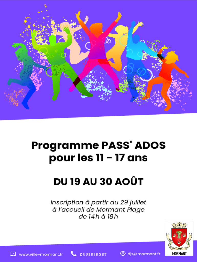 Programme PASS\' ADOS pour les 11 17 ans DU 19 AU 30 AOT Inscription partir du 29 juillet laccueil de Mormant Plage de 14 h 18 hwww.villemormant.fr06 81 51 50 97djs@mormant.frPARTIE CONSERVE PAR LE