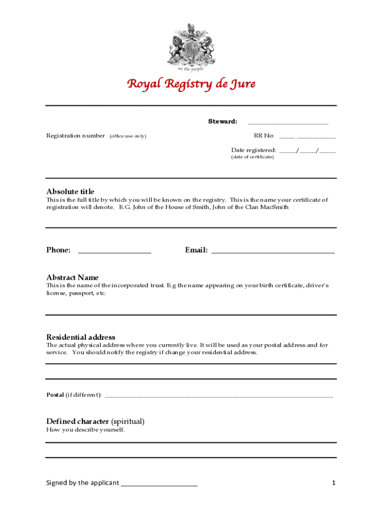 Royal Registry de Jure Steward: Registration number___ RR No: ___ ___(office use only)Date registered: ___/___/___ (date of certificate)Absolute titleThis is the full title by which you will be known