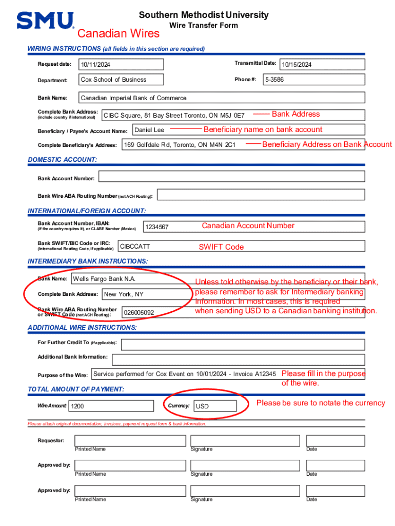 Southern Methodist University Wire Transfer FormCanadian WiresWIRING INSTRUCTIONS (all fields in this section are required) Request date:10/11/2024Transmittal Date:Department:Cox School of BusinessPhone