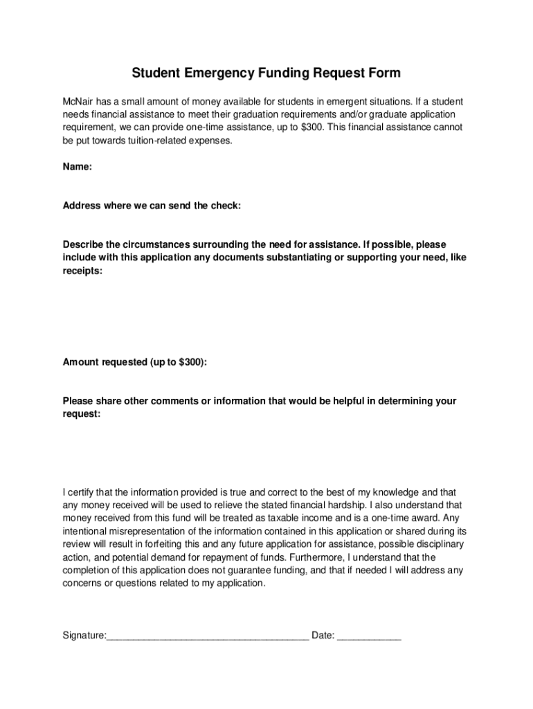 Student Emergency Funding Request Form McNair has a small amount of money available for students in emergent situations. If a student needs financial assistance to meet their graduation requirements