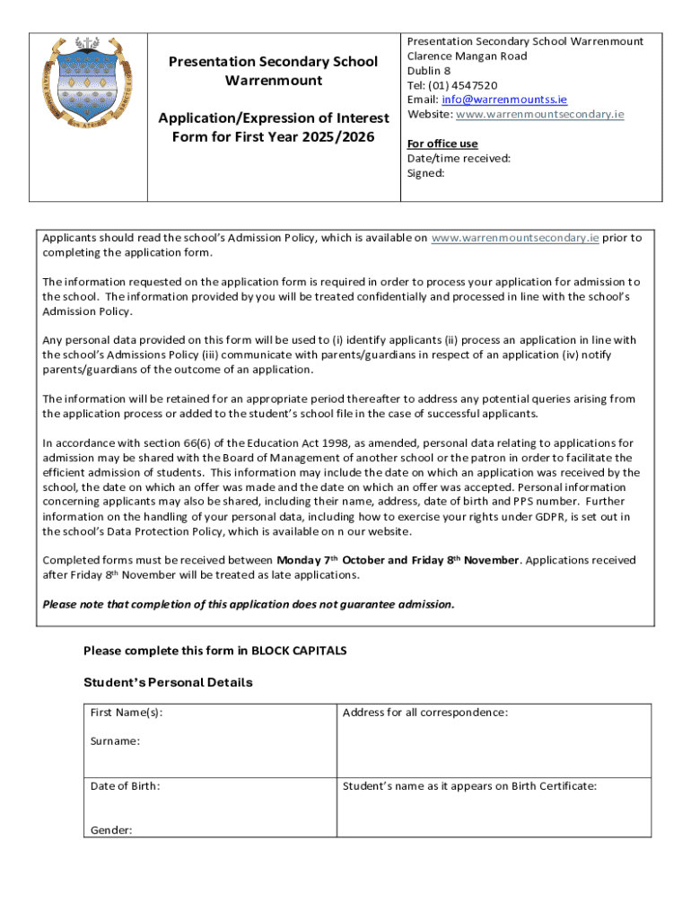 This document is an application form for prospective first-year students applying to Presentation Secondary School Warrenmount for the school year 2025/2026. It outlines the required personal details, current school information, and parent/guardian contact information. The form also includes consent regarding the handling of personal data and highlights important dates for application submission.