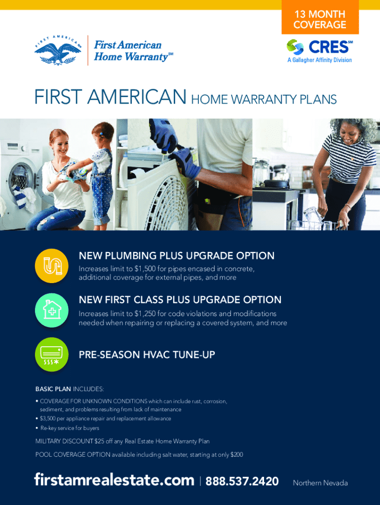 13 MONTH COVERAGEFIRST AMERICAN HOME WARRANTY PLANSNEW PLUMBING PLUS UPGRADE OPTION Increases limit to $1,500 for pipes encased in concrete, additional coverage for external pipes, and moreNEW FIRST