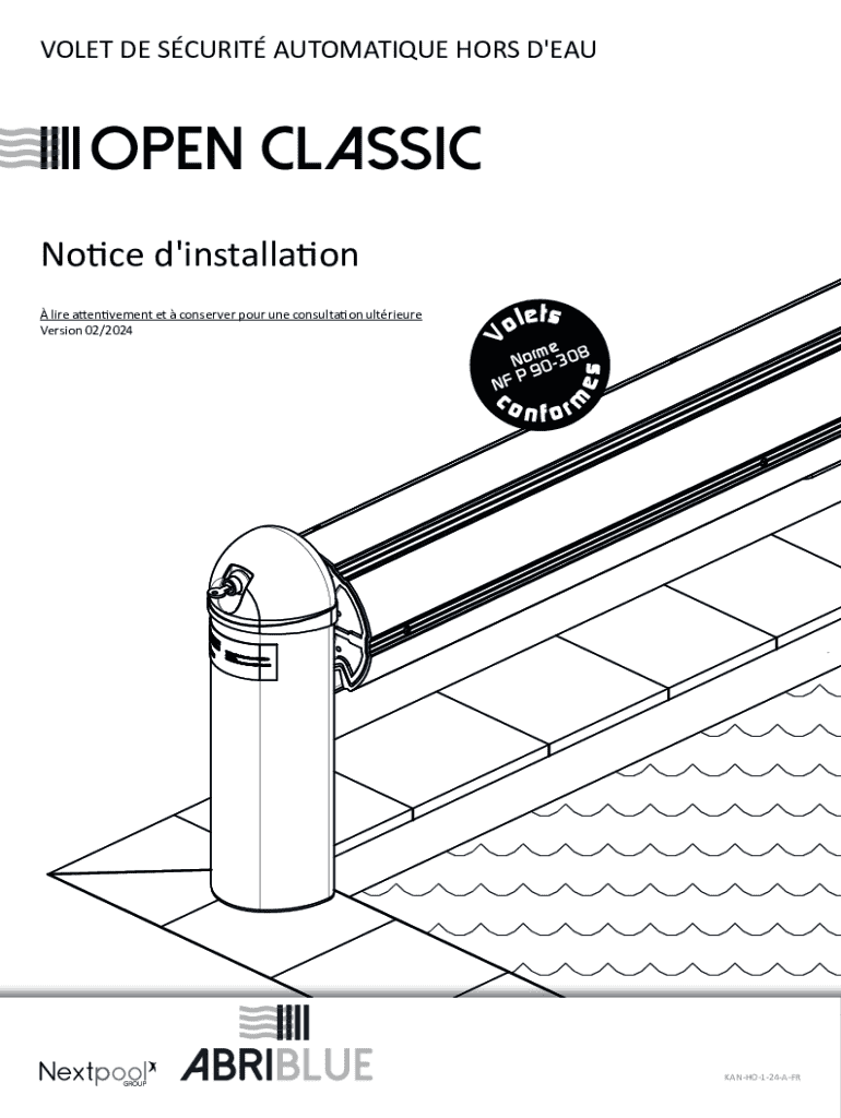 VOLET DE SCURIT AUTOMATIQUE HORS D\'EAUOPEN Classic oletscoesme Nor 0308 P9 NFnform lire attentivement et conserver pour une consultation ultrieure Version 02/2024VNotice d\'installationKANHO124AFRNotice