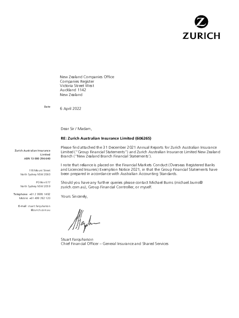 New Zealand Companies Office Companies Register Victoria Street West Auckland 1142 New Zealand Date6 April 2022Dear Sir / Madam, RE: Zurich Australian Insurance Limited (606265) Zurich Australian