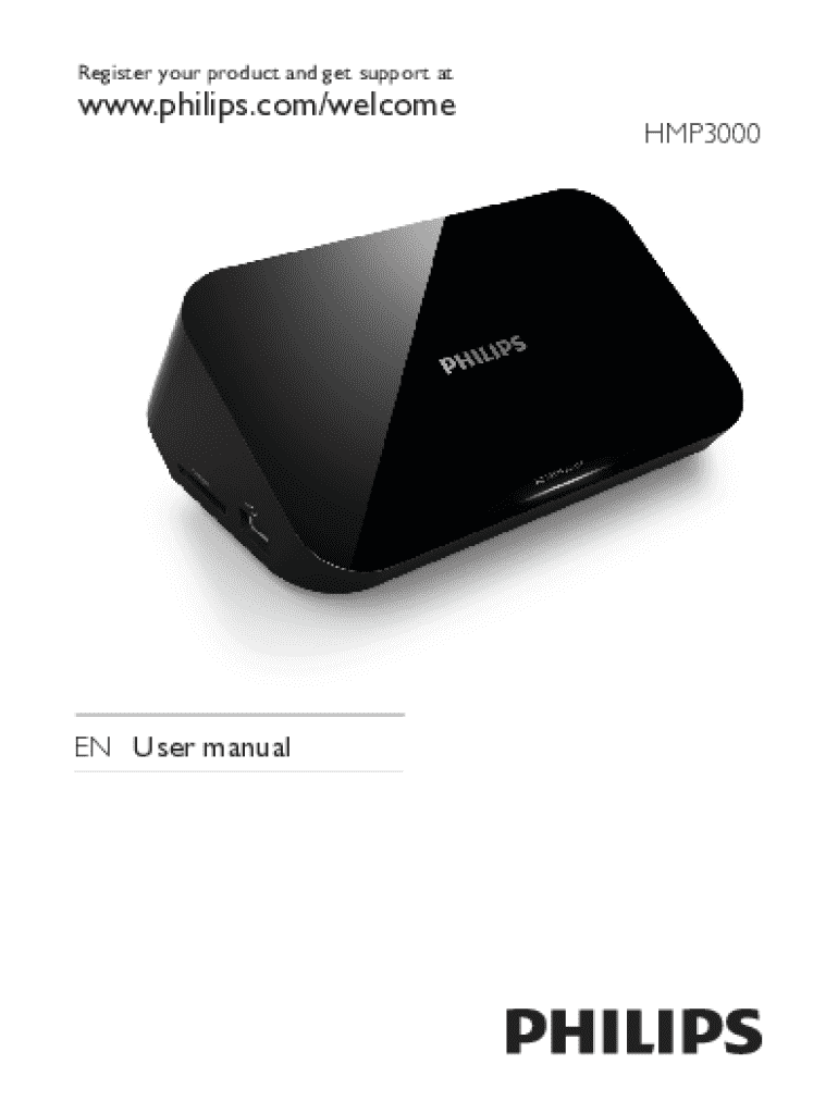 Register your product and get support atwww.philips.com/welcomeEN User manualHMP30001 Trademark notice 52 Connect and play 7 3 Control and play 11 4 Options 13 Video options 13 Audio option 14 Photo