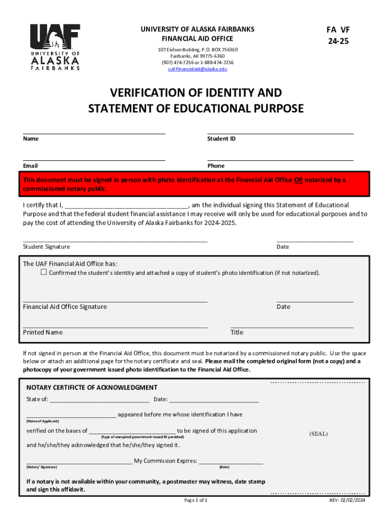 This document is used by students at the University of Alaska Fairbanks to verify their identity and confirm their educational purpose for receiving federal financial assistance for the 2024-2025 academic year. It requires either in-person signing with photo identification or notarization.