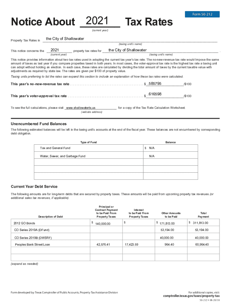 Form 502122021 Notice About ___ Tax Rates (current year)Property Tax Rates inthe City of Shallowater ___ (taxing units name)This notice concerns the2021 ___ (current year)property tax rates forthe