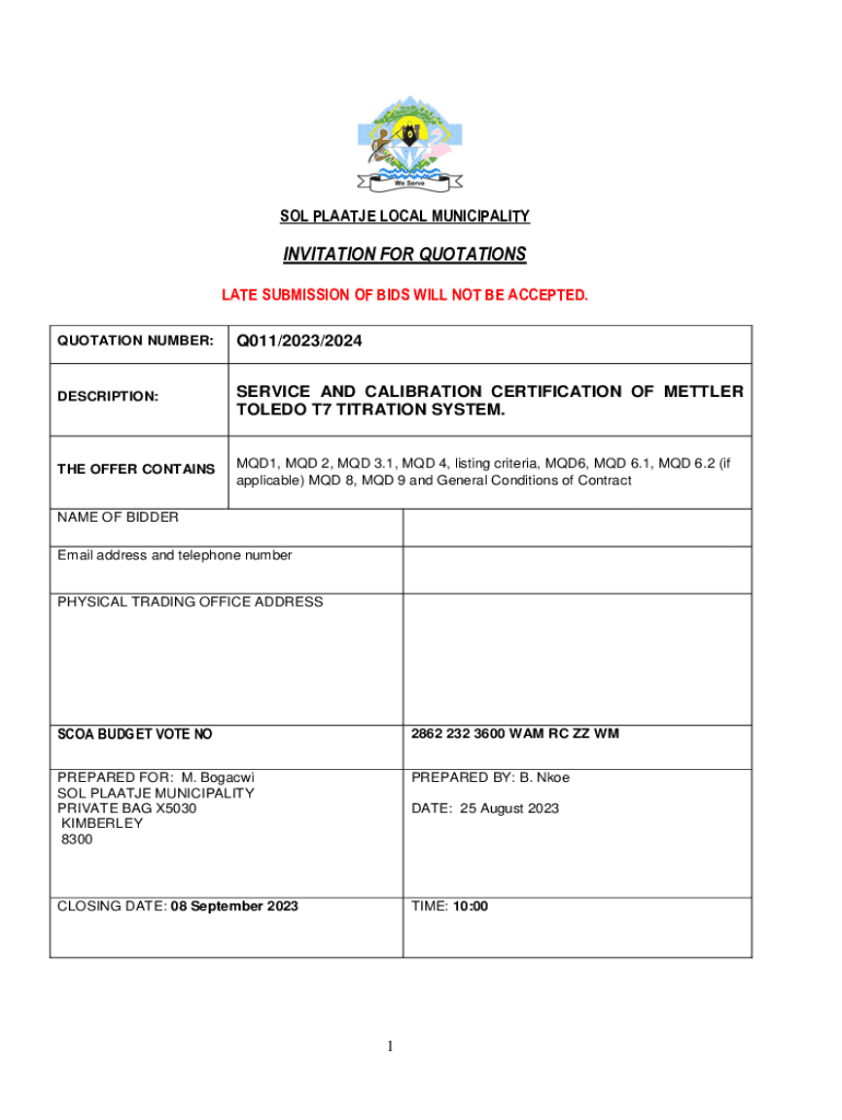 This document invites bids for the service and calibration certification of the Mettler Toledo T7 Titration System for the Sol Plaatje Municipality. The bid includes various conditions such as compliance, submission requirements, and evaluation criteria based on price and specific goals. The closing date for submissions is 08 September 2023 at 10:00 AM.