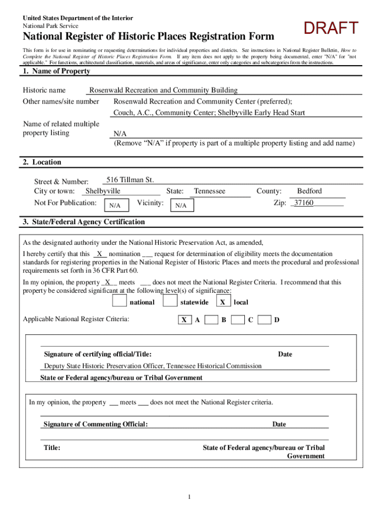 This document serves as a draft for nominating the Rosenwald Recreation and Community Center for inclusion in the National Register of Historic Places. It provides details on the property’s history, significance, architectural features, and the surrounding historically Black neighborhood in Shelbyville, Tennessee. Established in 1946, the center has been a vital resource for the local African American community, offering educational and recreational activities, particularly during the Jim...