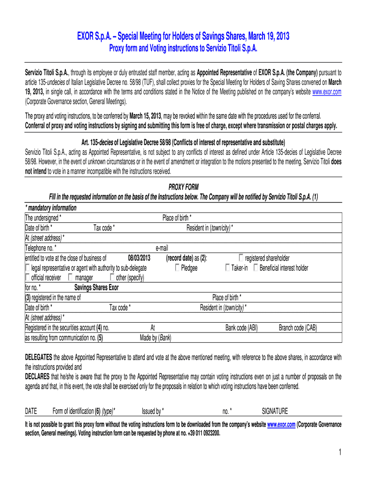 Get the free Proxy form and Voting instructions to Servizio Titoli SpA - Exor