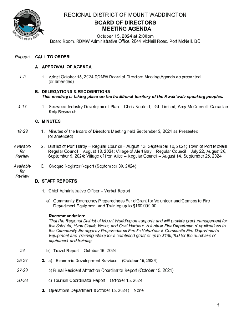 The agenda for the Regional District of Mount Waddington\'s Board of Directors meeting, featuring discussions on the approval of the agenda, delegation presentations including the Seaweed Industry Development Plan, staff reports, financial reports, bylaws, and other business. The meeting acknowledges traditional territories and outlines various community initiatives and grant applications.