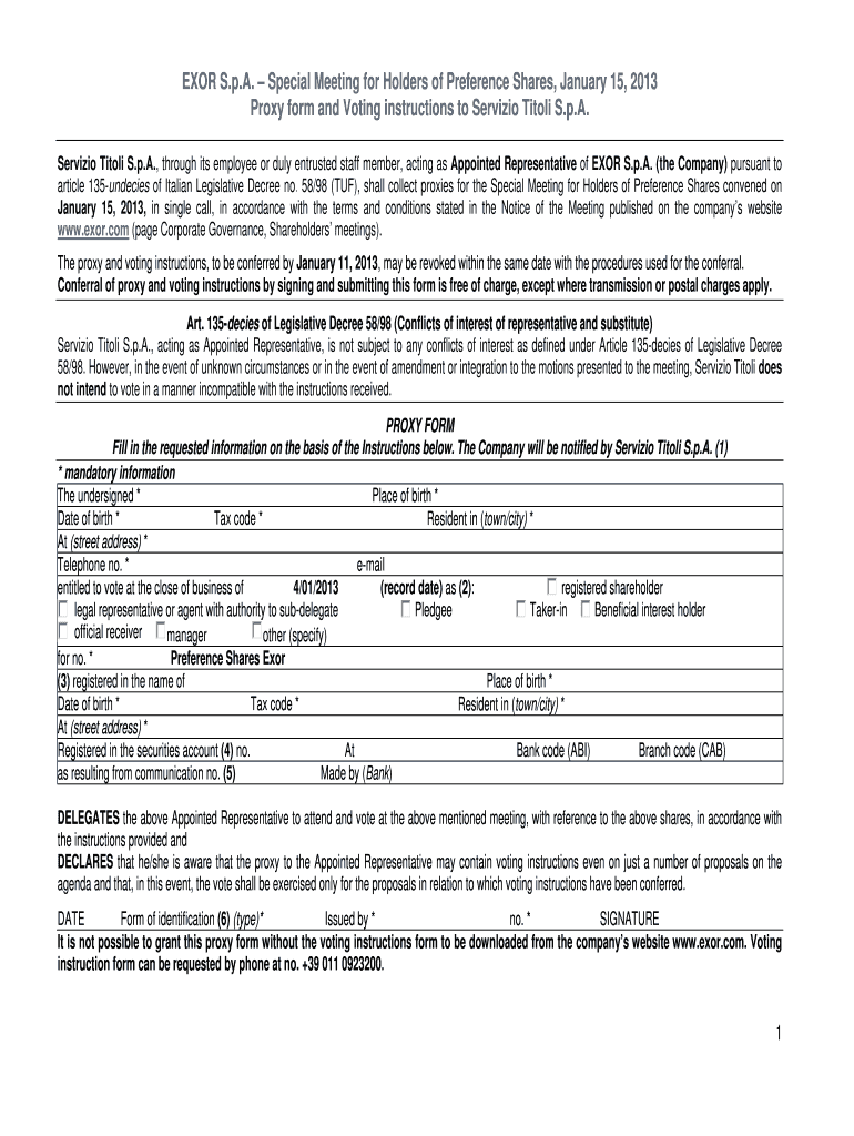 EXON S.p.A. Special Meeting for Holders of Preference Shares, January 15, 2013, Proxy form and Voting instructions to Servillo Title S.p.A. Servillo Title S.p.A., through its employee or duly entrusted