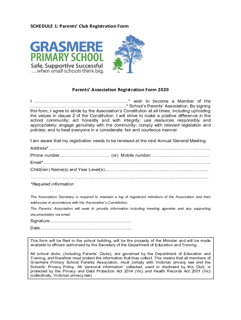 SCHEDULE 1: Parents Club Registration FormParents Association Registration Form 2020 I * wish to become a Member of the ..* Schools Parents Association. By signing this form, I agree to abide by the