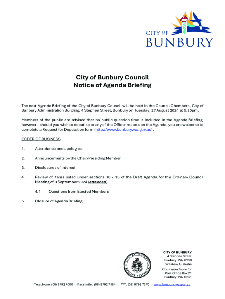 City of Bunbury Council Notice of Agenda Briefing The next Agenda Briefing of the City of Bunbury Council will be held in the Council Chambers, City of Bunbury Administration Building, 4 Stephen Street,
