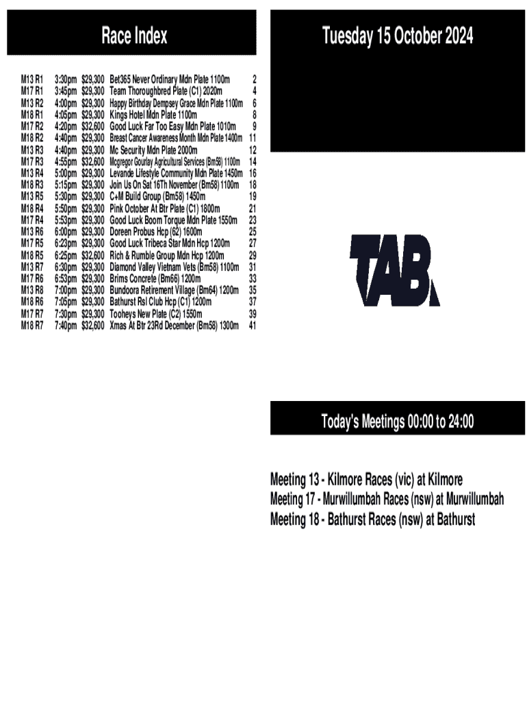 Race Index M13 R1 M17 R1 M13 R2 M18 R1 M17 R2 M18 R2 M13 R3 M17 R3 M13 R4 M18 R3 M13 R5 M18 R4 M17 R4 M13 R6 M17 R5 M18 R5 M13 R7 M17 R6 M13 R8 M18 R6 M17 R7 M18 R73:30pm 3:45pm 4:00pm 4:05pm 4:20pm