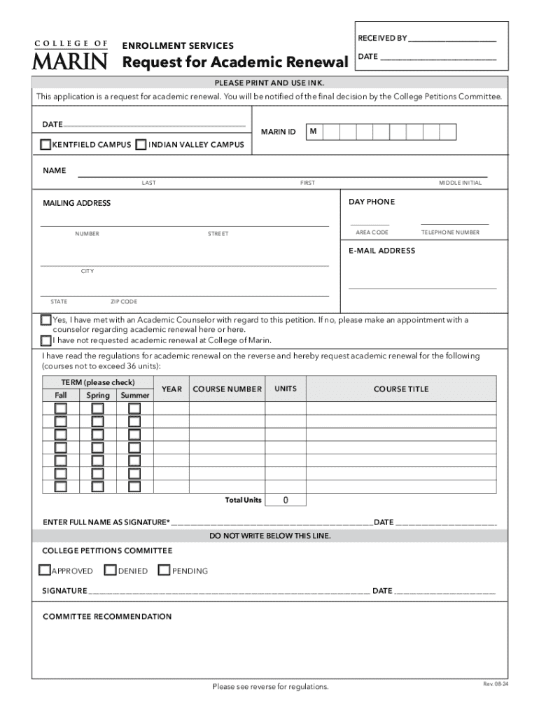 This form is used to request academic renewal at the College of Marin, allowing students to negate the impact of past academic failures without course repetition. It outlines the eligibility requirements, necessary procedures, and provides a section for the student to apply for academic renewal.