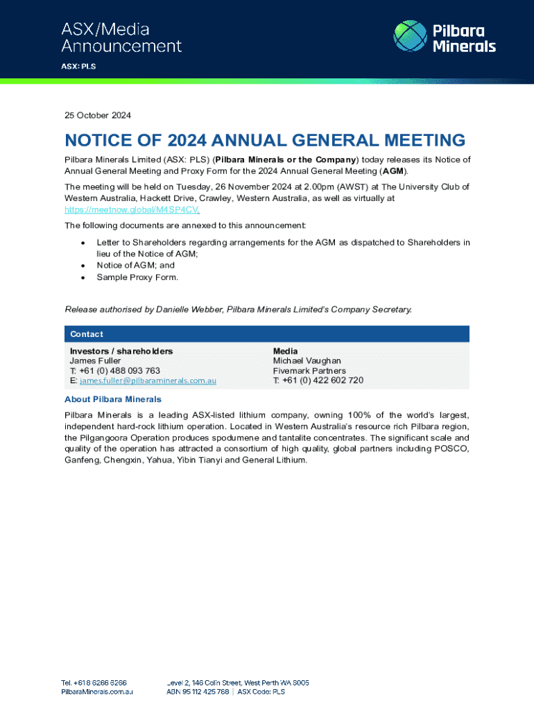 This document serves as the official notice and proxy form for the Annual General Meeting of Pilbara Minerals Limited, scheduled for November 26, 2024. It includes details regarding the meeting\'s time, location, voting procedures, and resolutions to be voted on, including the remuneration report and election of directors.