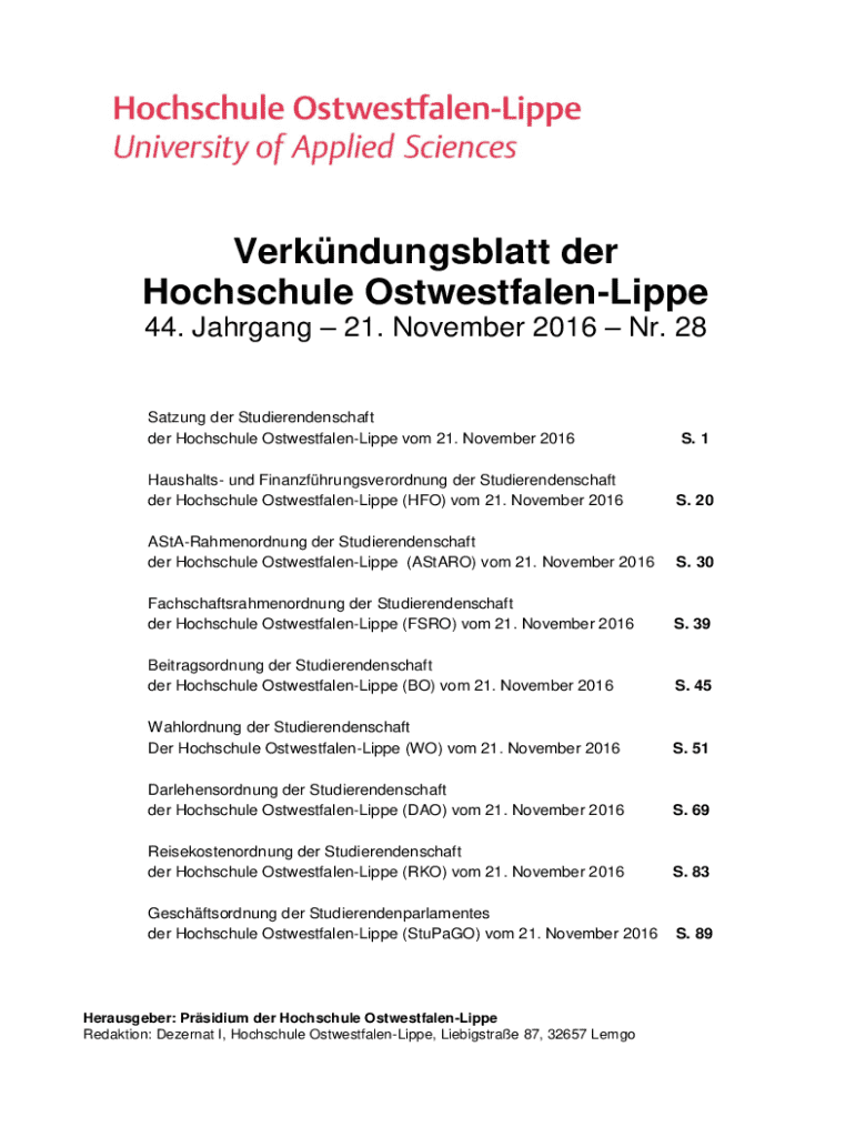 Verkndungsblatt der Hochschule OstwestfalenLippe 44. Jahrgang 21. November 2016 Nr. 28Satzung der Studierendenschaft der Hochschule OstwestfalenLippe vom 21. November 2016S. 1Haushalts und Finanzfhrungsverordnung