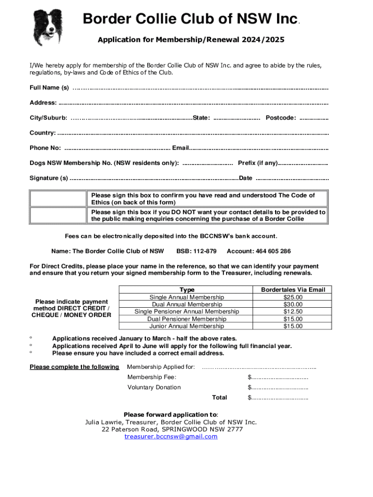 This document is an application form for membership or renewal of membership for the Border Collie Club of NSW Inc. It requires personal details, agreement to adhere to the Club\'s rules and Code of Ethics, and payment information for various types of memberships. It also outlines a Code of Ethics for caring, breeding, and selling Border Collies.