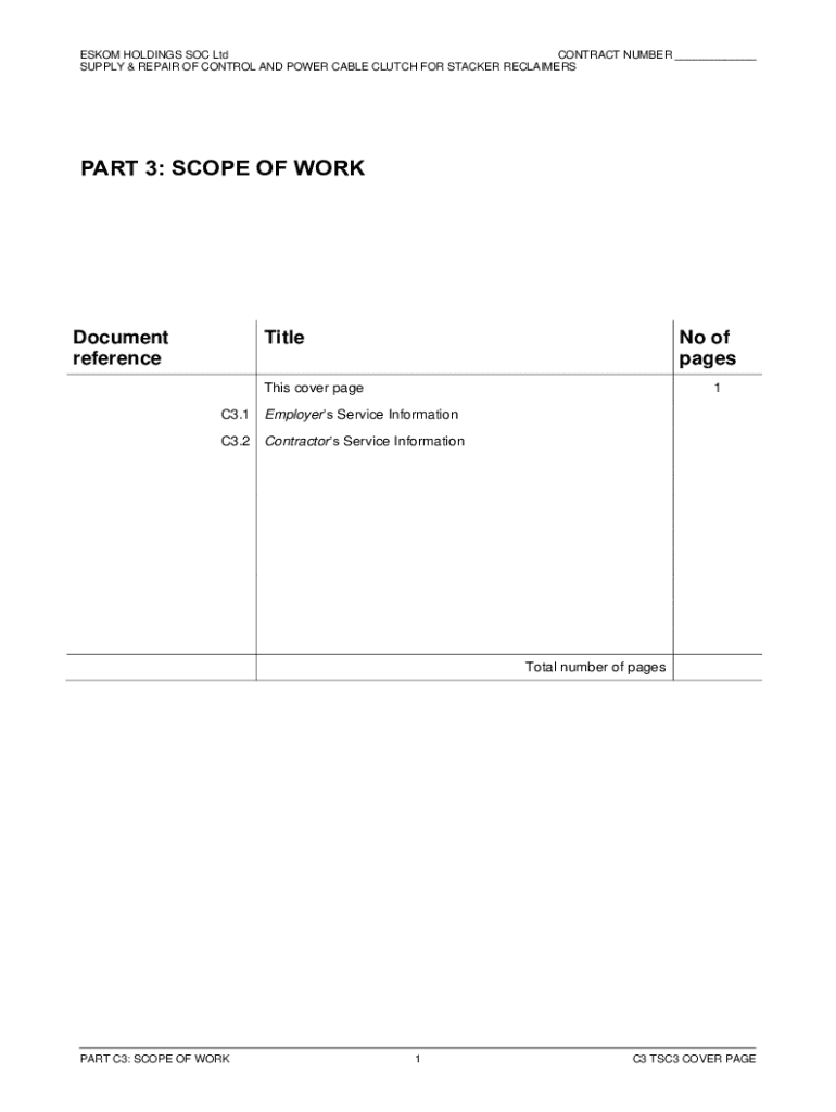 ESKOM HOLDINGS SOC Ltd CONTRACT NUMBER ___ SUPPLY & REPAIR OF CONTROL AND POWER CABLE CLUTCH FOR STACKER RECLAIMERSPART 3: SCOPE OF WORKDocument referenceTitleNo of pagesThis cover page1C3.1 Employers