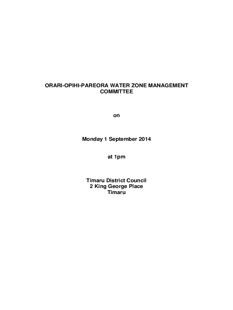 ORARIOPIHIPAREORA WATER ZONE MANAGEMENT COMMITTEEonMonday 1 September 2014at 1pmTimaru District Council 2 King George Place TimaruORARIOPIHIPAREORA WATER ZONE MANAGEMENT COMMITTEENotice is hereby