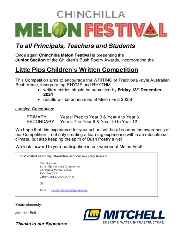 To all Principals, Teachers and Students Once again Chinchilla Melon Festival is presenting the Junior Section of the Childrens Bush Poetry Awards, incorporating theLittle Pips Childrens Written Competition