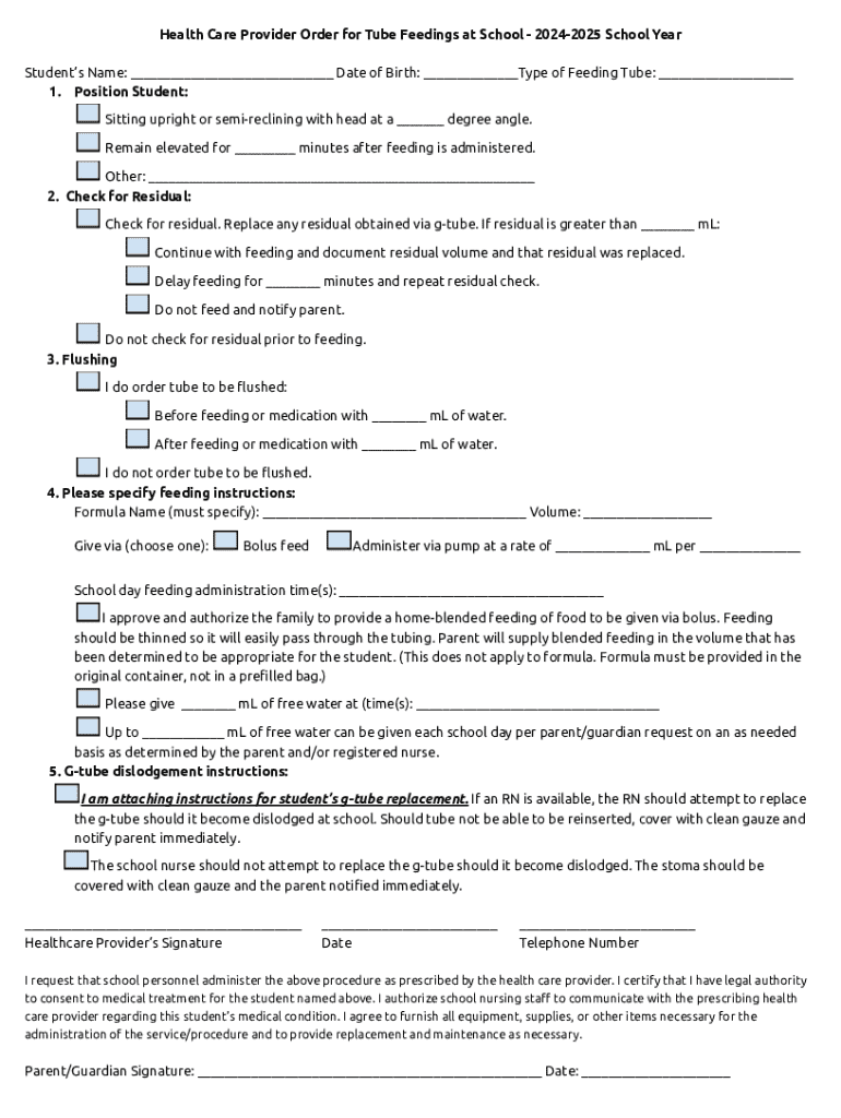 Health Care Provider Order for Tube Feedings at School 20242025 School Year Students Name: ___ Date of Birth: ___Type of Feeding Tube: ___ 1. Position Student: Sitting upright or semireclining with