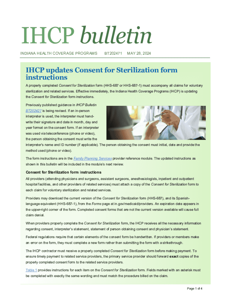 IHCP bulletin INDIANA HEALTH COVERAGE PROGRAMSBT202471MAY 28, 2024IHCP updates Consent for Sterilization form instructions A properly completed Consent for Sterilization form (HHS687 or HHS6871) must
