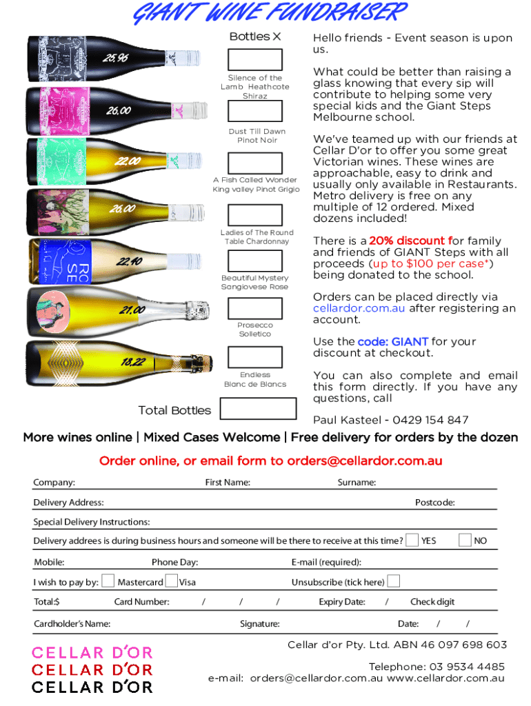 This document outlines the details for a wine fundraising event aimed at supporting the Giant Steps Melbourne school. It includes descriptions and prices of various wines available for purchase, instructions for placing orders, and details regarding discounts and donations.