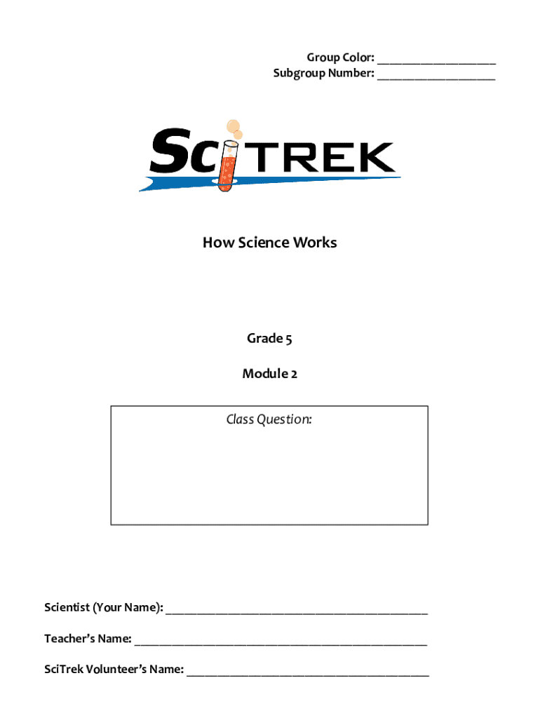 Group Color: ___ Subgroup Number: ___How Science WorksGrade 5 Module 2 Class Question:Scientist (Your Name): ___ Teachers Name: ___ SciTrek Volunteers Name: ___VOCABULARY Science: The study of the