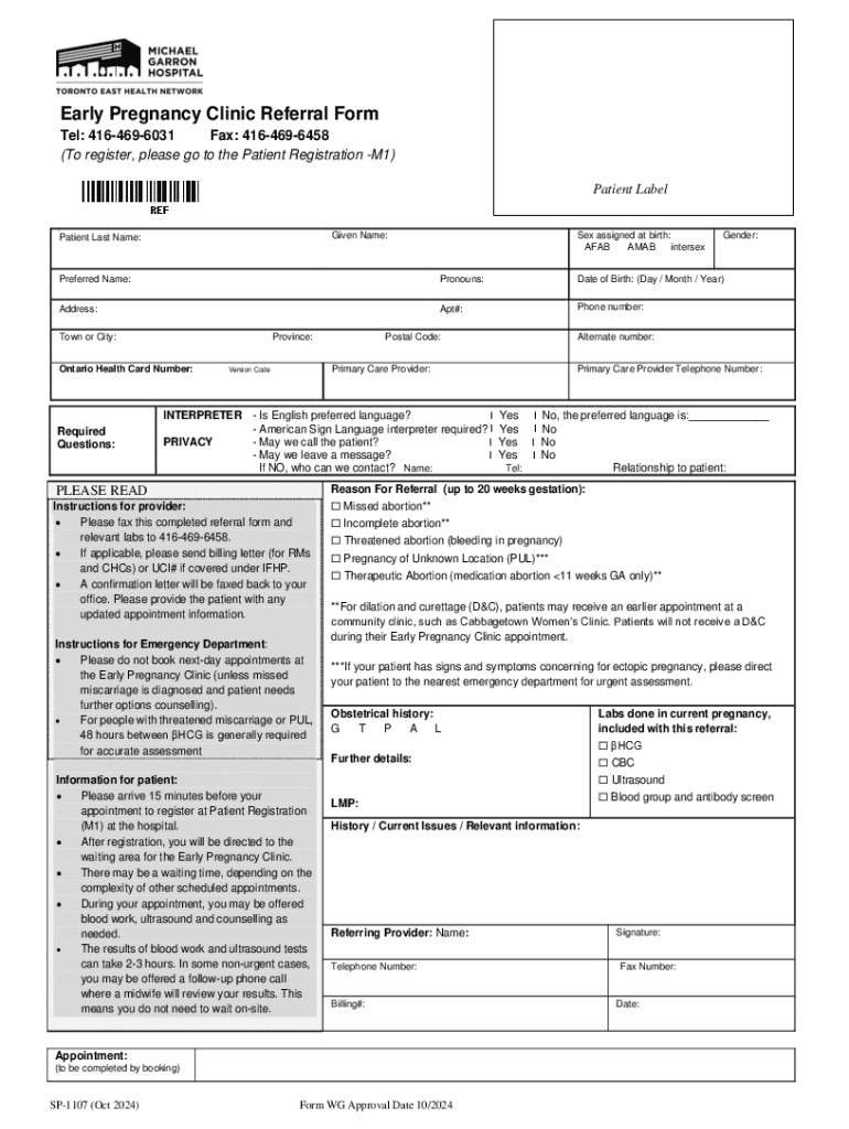 Early Pregnancy Clinic Referral Form Tel: 4164696031 Fax: 4164696458 (To register, please go to the Patient Registration M1) Patient Label Given Name:Patient Last Name:Sex assigned at birth: AFAB