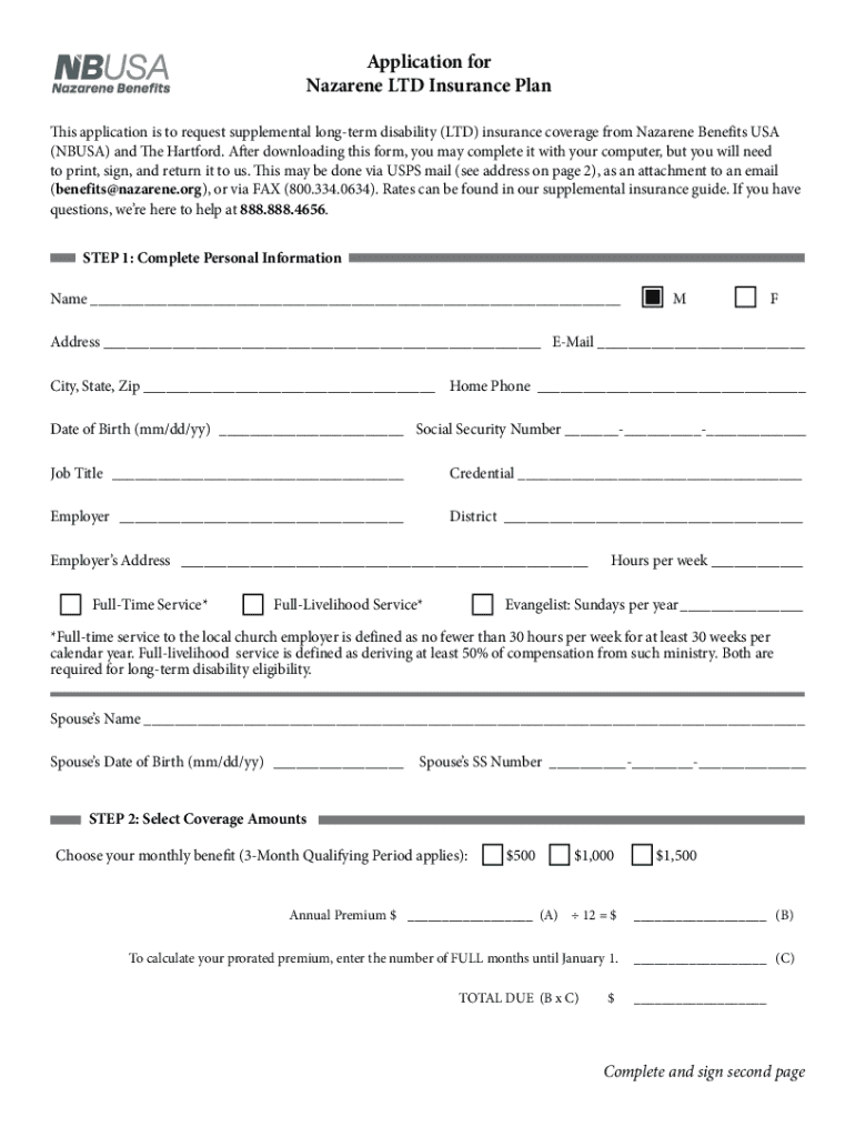 This document serves as an application form to request supplemental long-term disability insurance coverage from Nazarene Benefits USA and The Hartford. It outlines the steps required to complete the application, including personal information submission, coverage selection, and payment instructions.