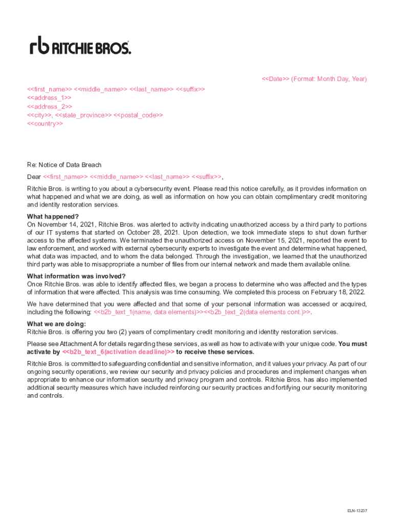 Date (Format: Month Day, Year) first_name middle_name last_name suffix address_1 address_2 city, state_province postal_code countryRe: Notice of Data Breach Dear first_name middle_name last_name suffix,