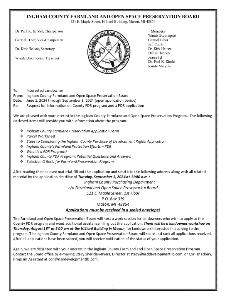 This document serves as an application for the Ingham County Farmland and Open Space Preservation Program, a voluntary initiative designed to protect valuable farmland through the Purchase of Development Rights (PDR) Program. It provides information about the application process, requirements, and deadlines for landowners interested in preserving their agricultural land.