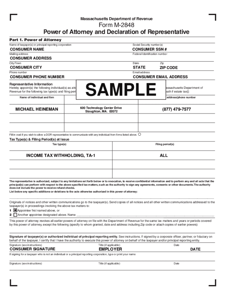 Form M-2848 is a tax form used to authorize an individual or organization to act on behalf of a taxpayer in matters related to the Department of Revenue.
