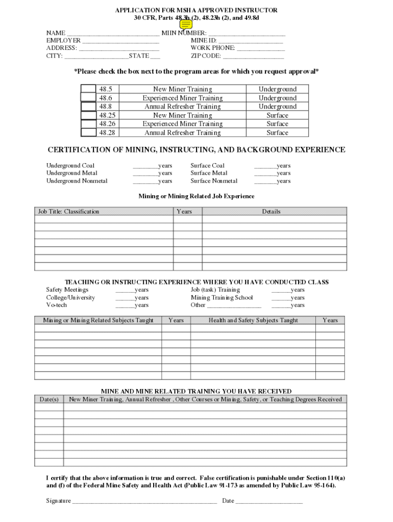 APPLICATION FOR MSHA APPROVED INSTRUCTOR 30 CFR, Parts 48.3h (2), 48.23h (2), and 49.8d NAME ___ MIIN NUMBER: ___ EMPLOYER ___ MINE ID: ___ ADDRESS: ___ WORK PHONE: ___ CITY: ___STATE ___ ZIP CODE: