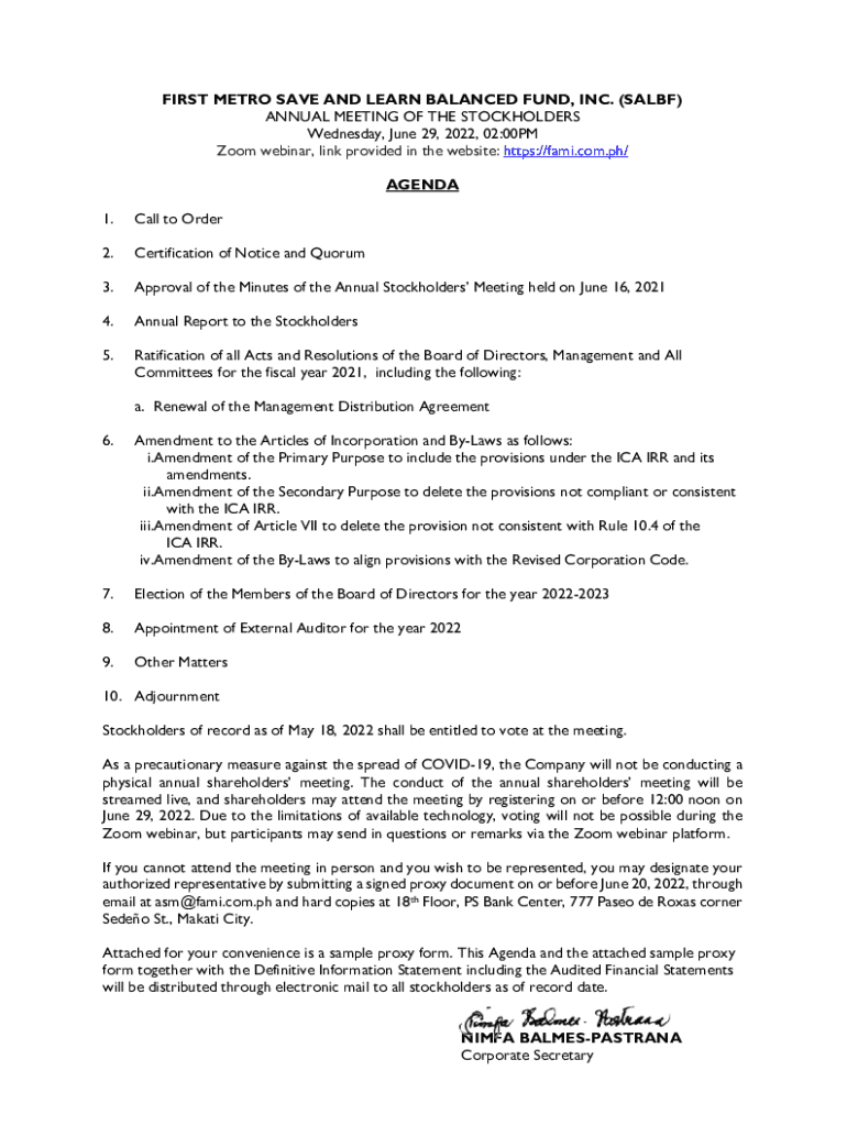 This document provides details about the annual meeting of the stockholders of First Metro Save and Learn Balanced Fund, Inc. (SALBF). It outlines the agenda, instructions for participation via Zoom, and the proxy voting process for stockholders who cannot attend in person. The document also includes information about the corporation\'s amendments to the Articles of Incorporation and By-Laws, election of directors, and the appointment of external auditors.