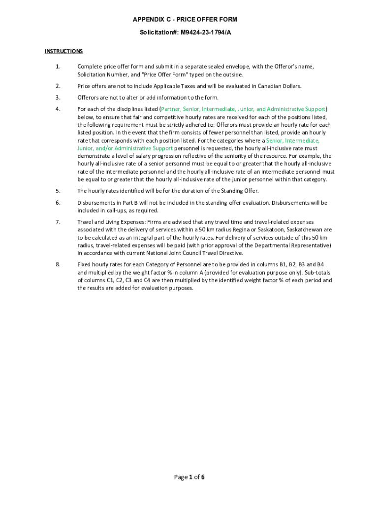 APPENDIX C PRICE OFFER FORM Solicitation#: M9424231794/A INSTRUCTIONS 1.Complete price offer form and submit in a separate sealed envelope, with the Offerors name, Solicitation Number, and \"Price