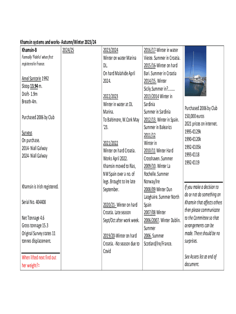 Khamsin systems and works Autumn/Winter 2023/24 KhamsinB 2024/25 Formally Fidelio when first registered in France.Amel Santorin 1992 Sloop 13.94 m. Draft 1.9m Breath4m. Purchased 2006 by Club Surveys